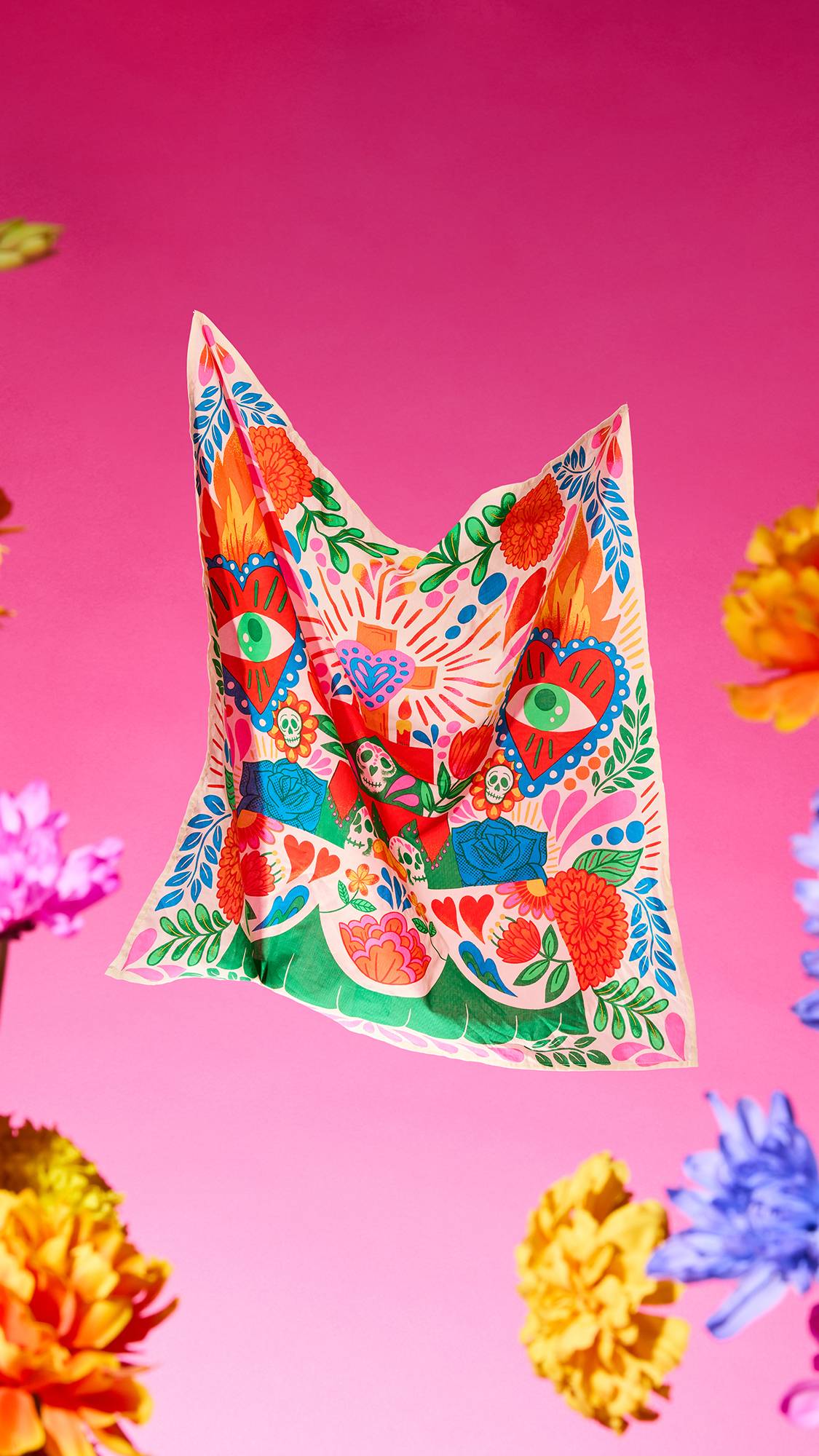 Designed by California based graphic designer and illustrator, Blanca Molina. Born in Mexico, Blanca is inspired by her Mexican heritage and aims to inspire happiness, nostalgia and creativity with her work. She’s said about this design, “Día de Muertos is a celebration where we honor and remember our loved ones in a positive way. With my design, I wanted to capture that same spirit — using vibrant colors and movement to reflect joy and life, while still honoring the traditional imagery of Día de Muertos.”