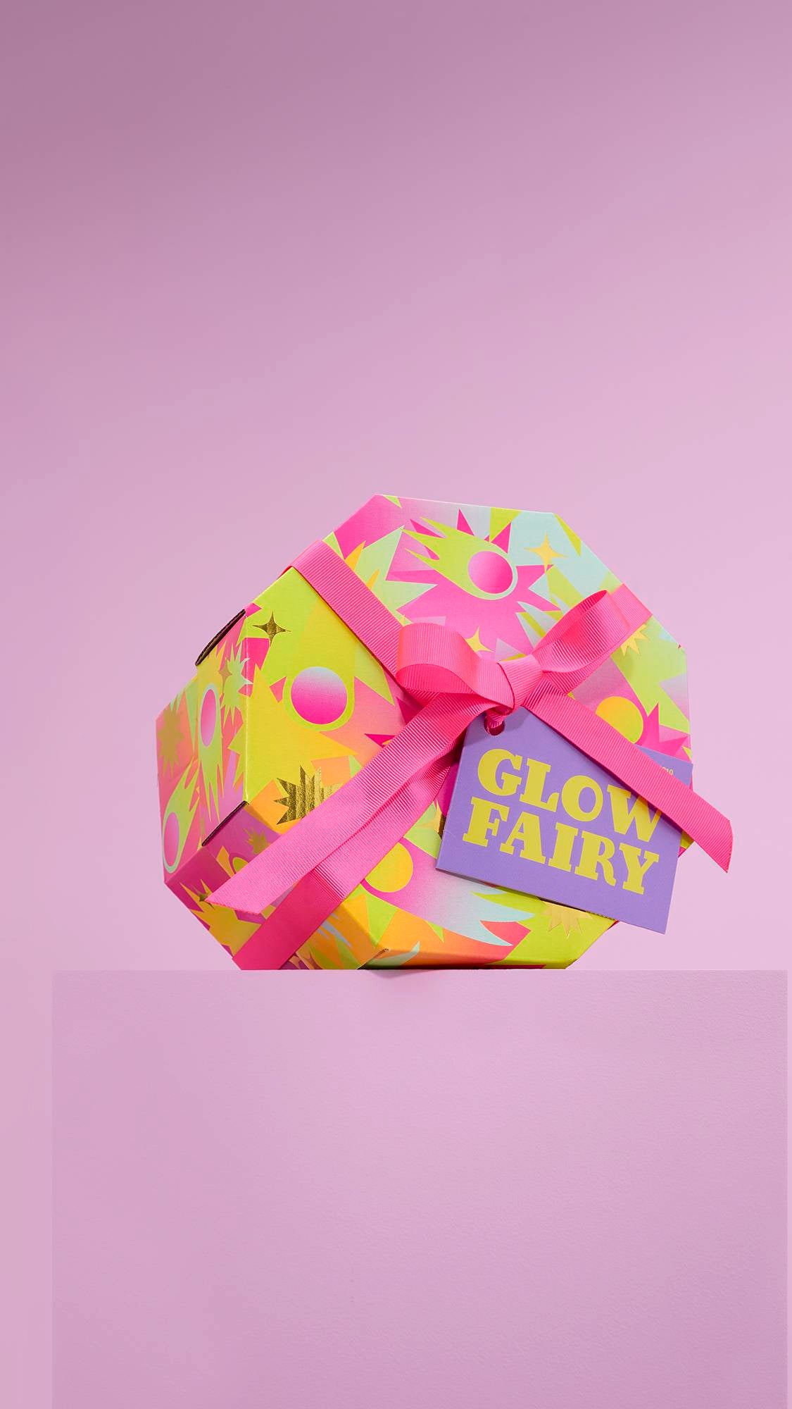 Lush Gift Designer Grace Cole, says “I wanted to create a design based on the idea of a glowing fairy surrounded by comets and stars. I love how the neon gradients make it feel otherworldly and full of cosmic magic.”